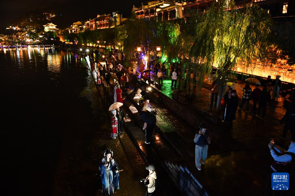 鳳凰古城位于湖南省湘西土家族苗族自治州鳳凰縣,沱江穿城而過,城內(nèi)古建筑、特色民居眾多。近年來,當(dāng)?shù)爻掷m(xù)規(guī)范旅游市場(chǎng),發(fā)展旅拍等旅游服務(wù)。游客們身著帶有當(dāng)?shù)孛褡逄厣姆椔姐瓋砂?,欣賞古城美景,感受民俗風(fēng)情。