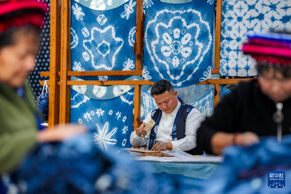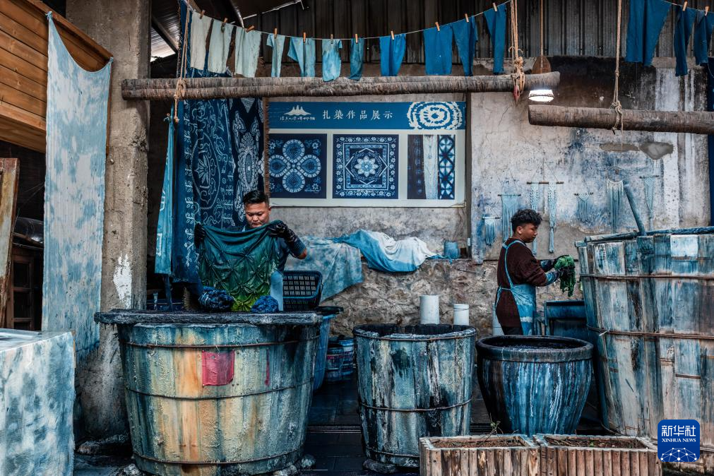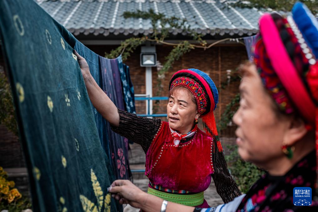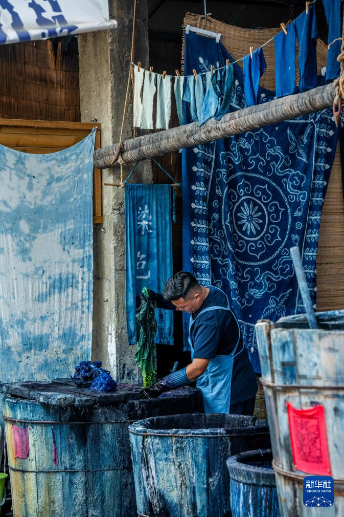 白族扎染以板藍根為主要染料,工序包含繪圖、制版、印花、扎花、染色、漂洗、拆花、晾曬等。其中,扎花、浸染為核心步驟,手工藝人執(zhí)針走線,在布料上扎出不同類型的圖案,再用植物染料染出藍底白花、生靈百態(tài)。2006年,白族扎染被列入第一批國家級非物質(zhì)文化遺產(chǎn)名錄。