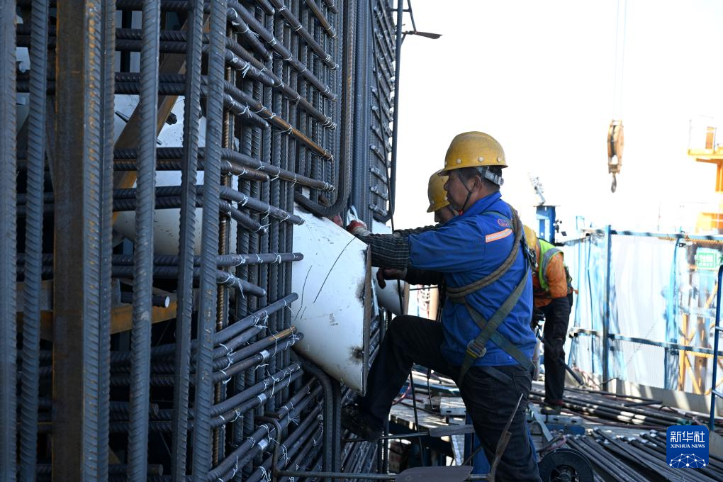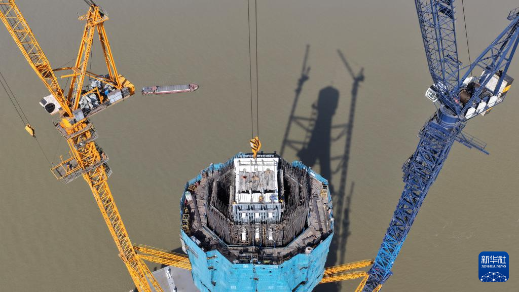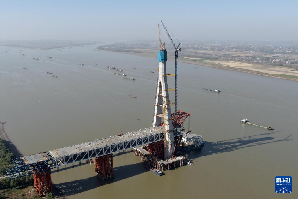 11月28日拍攝的池州長(zhǎng)江公鐵大橋4號(hào)主塔施工現(xiàn)場(chǎng)(無(wú)人機(jī)照片)。