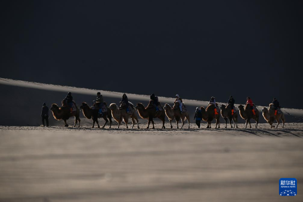 12月1日,游客在甘肅省敦煌市鳴沙山月牙泉景區(qū)游覽。