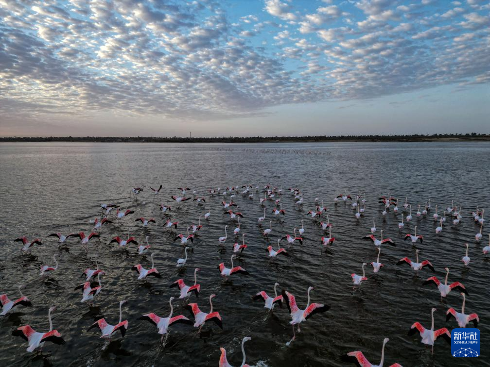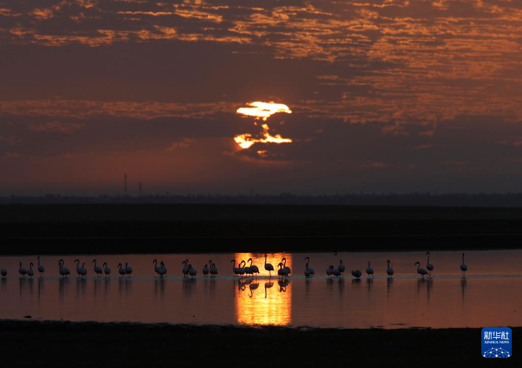 這是12月6日日出時分在埃及法尤姆省加龍湖拍攝的火烈鳥。