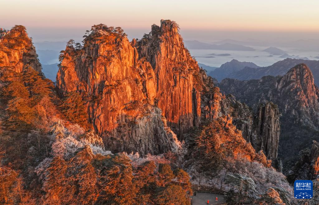 雪后初霽的安徽省黃山風(fēng)景區(qū)銀裝素裹,初升的朝陽與奇松、怪石交相映襯,吸引眾多游客前來賞雪觀景。