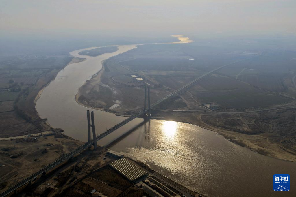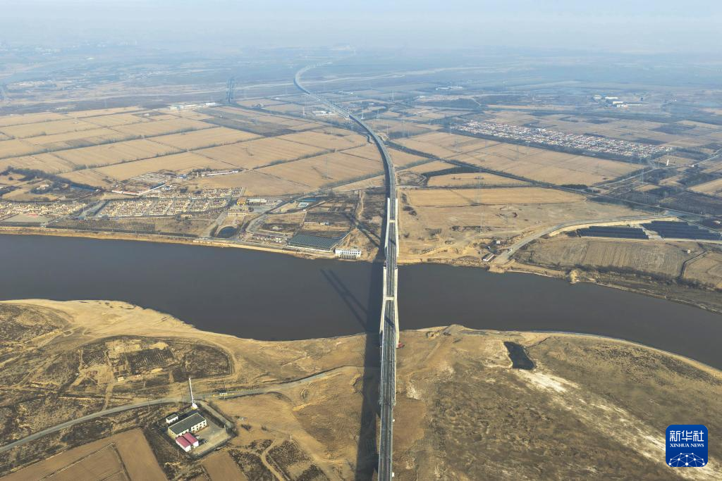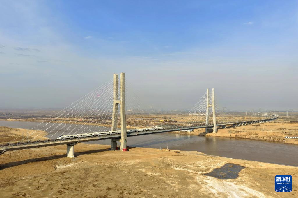 12月22日,試驗(yàn)列車駛過包銀高鐵烏海黃河特大橋(無人機(jī)照片)。