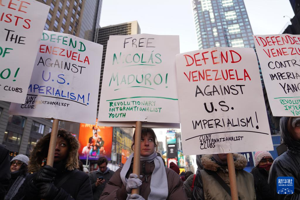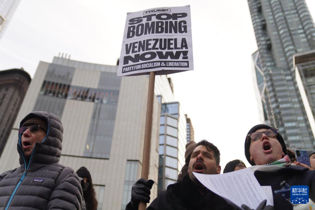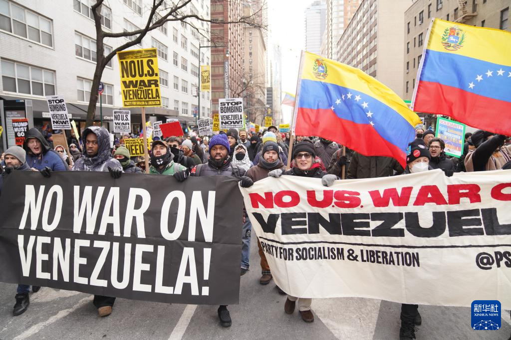 當(dāng)日,近千名民眾在美國紐約舉行集會游行,抗議美國對委內(nèi)瑞拉實施軍事打擊。