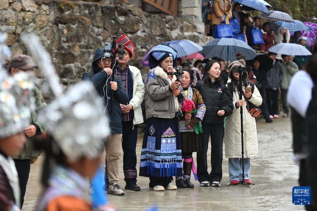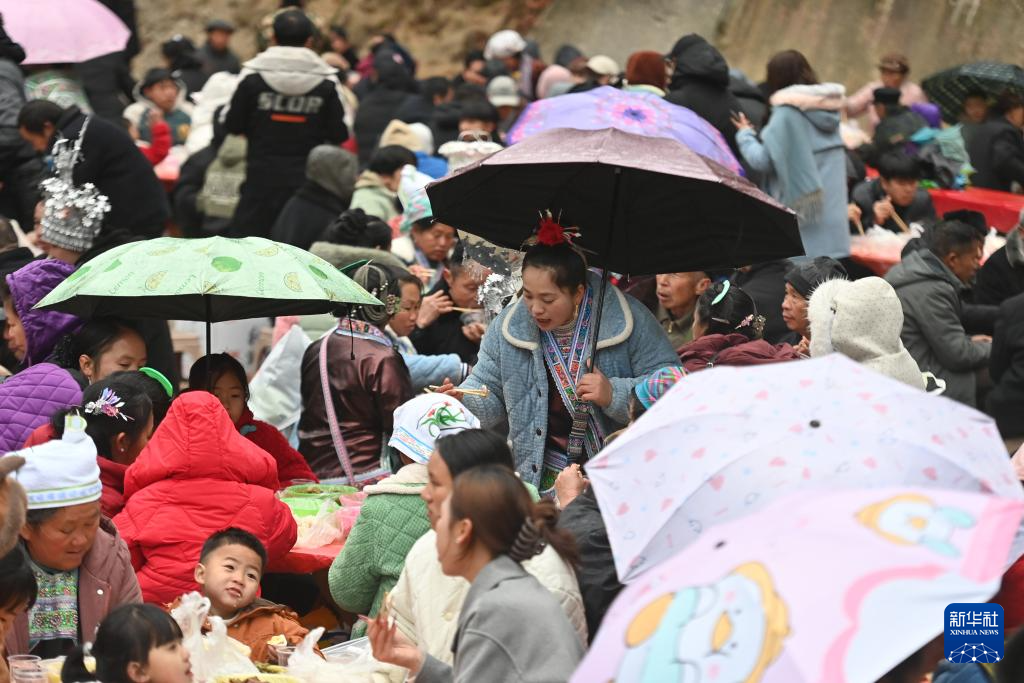 1月20日是大寒節(jié)氣,廣西柳州市融水苗族自治縣桿洞鄉(xiāng)黨鳩村舉辦傳統(tǒng)苗年慶祝活動,當(dāng)?shù)厝罕姾陀慰驮诤L(fēng)細(xì)雨中吹蘆笙、唱苗歌、跳苗舞、品百家宴,共度佳節(jié)。