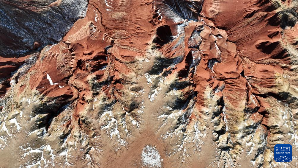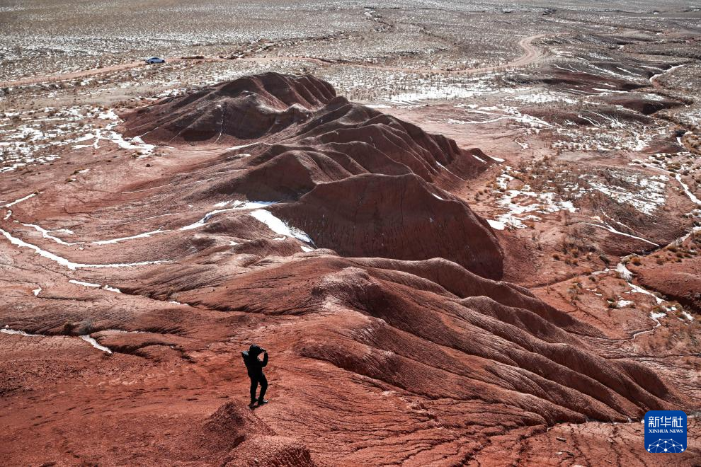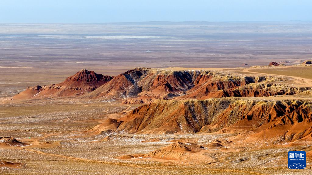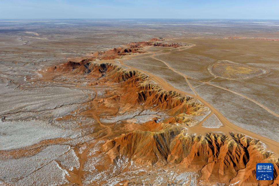 紅崖臺地位于內蒙古烏蘭察布市四子王旗北部,是內蒙古四子王國家地質公園的重要組成部分。這里山丘聳立、溝壑縱橫,山體呈現(xiàn)赤紅色。隆冬時節(jié),稀薄殘雪點綴其間,在蒼茫天地中勾勒出一幅靜謐而壯麗的自然畫卷。