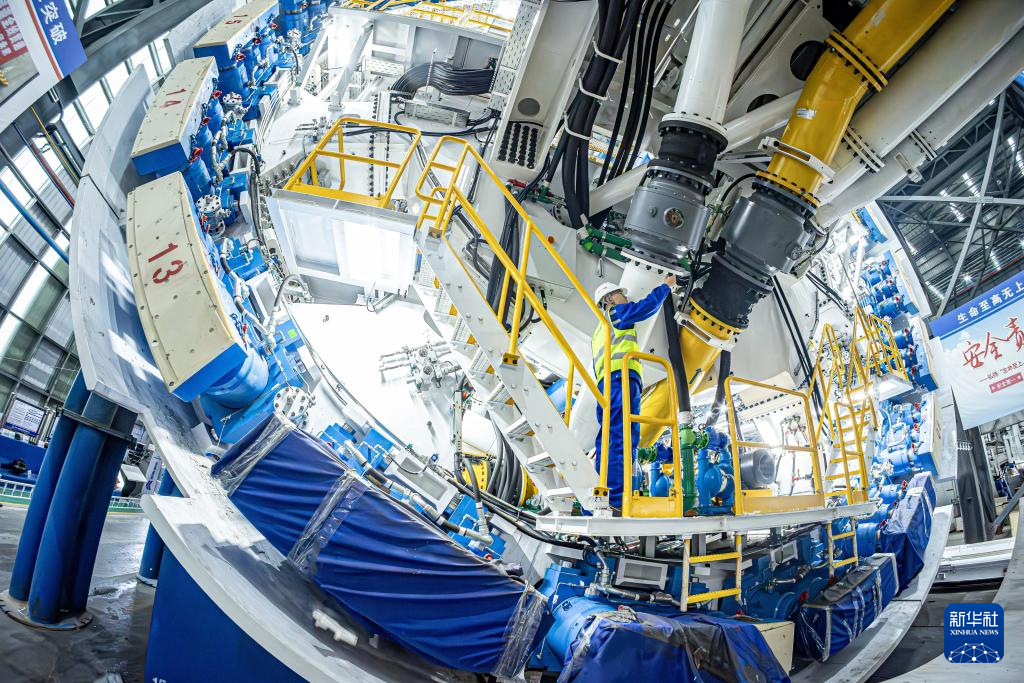 3月31日拍攝的“奮楫號(hào)”盾構(gòu)機(jī)下線現(xiàn)場(無人機(jī)照片)。