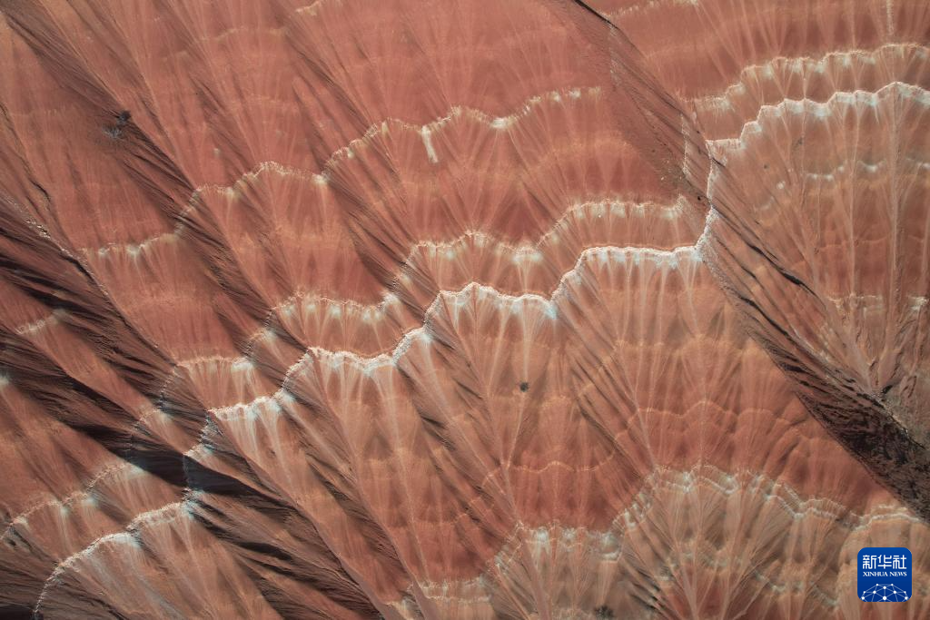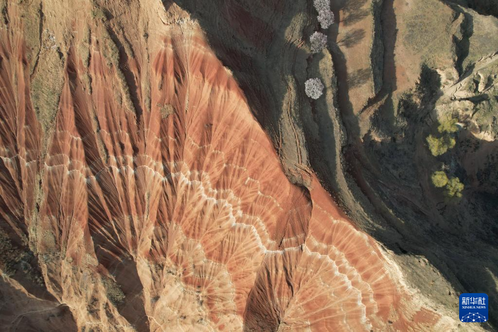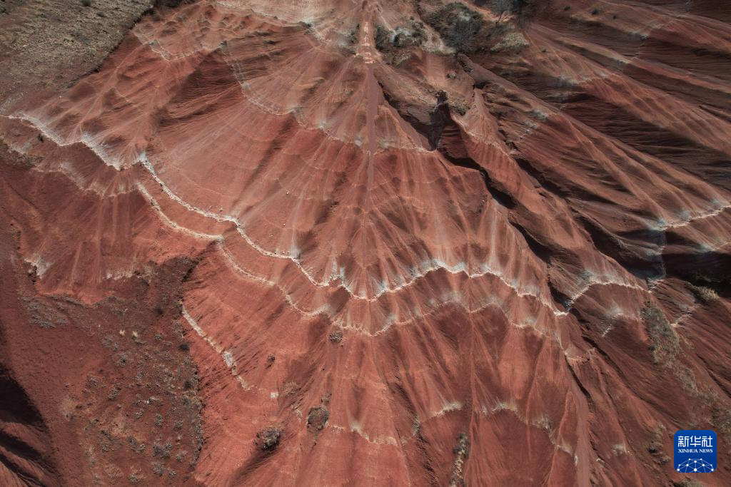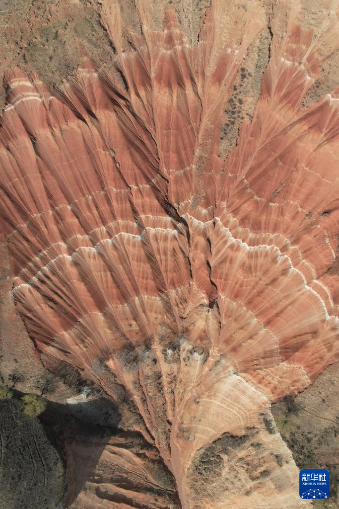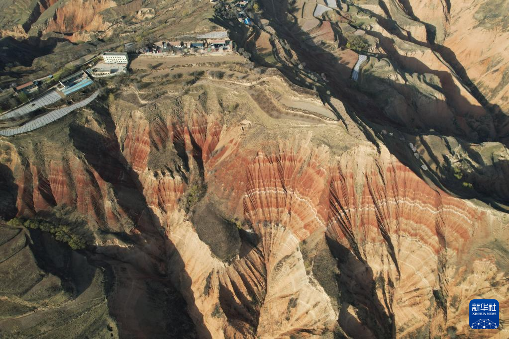 在甘肅省臨夏回族自治州東鄉(xiāng)族自治縣東塬鄉(xiāng)境內(nèi),有山嶺巖層紅褐與灰白相間,從高空俯瞰,形似一片片鋪開的“羊肉卷”。